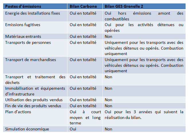 En effet, le périmètre restreint peut assez simplement être comblé en termes de collecte de données, et la dimension « projet d’entreprise » est bien moins présente puisque le périmètre ne tient compte que de données simples et souvent déjà suivies, quand le bilan carbone amène à se poser des questions en termes d’impacts indirect et de vulnérabilité face à l’épuisement des ressources fossiles, et notamment de ses couts directs et indirects.