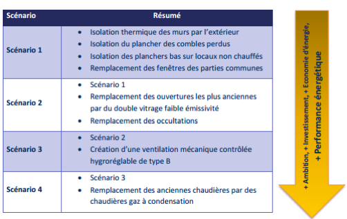 L’audit a permis d’établir 4 scénarii d’améliorations thermiques hiérarchisés selon les performances, les économies d’énergie, les améliorations de confort et également le niveau d’investissement nécessaire :
