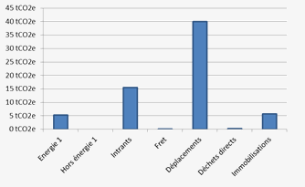 Ces résultats se ventilent d’une façon assez classique pour une activité tertiaire (Voir graphique ci-dessus).Les déplacements de personne constituent le premier poste d’émission avec 60 % des émissions. Ensuite, les achats et les immobilisations (postes informatiques) constituent respectivement les 2nd et 3ème postes d’émission avec 23 et 9 % des émissions.