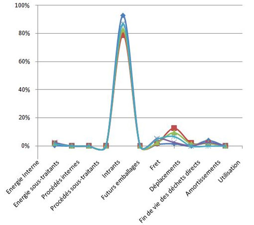 Le graphique suivant montre ainsi pour plusieurs projets ECIC le profil très marqué de répartition de l’impact de chacun des postes d’émissions du bilan carbone de la construction du projet.