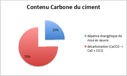 Si on regarde en détail les émissions liées à la production de ciment (composant essentiel du béton), on s’aperçoit que près des trois quart des émissions à la tonne sont liées à la réaction de décarbonatation du ciment qui transforme le CaCO3 en CaO + CO2, le quart restant étant lié aux consommations énergétiques pour la fabrication du ciment.