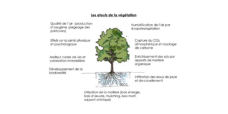 De part notamment les matériaux qui y sont mis en œuvre, il fait plus chaud en ville l’été qu’à la campagne, où la végétation joue par exemple le rôle de climatiseur naturel.